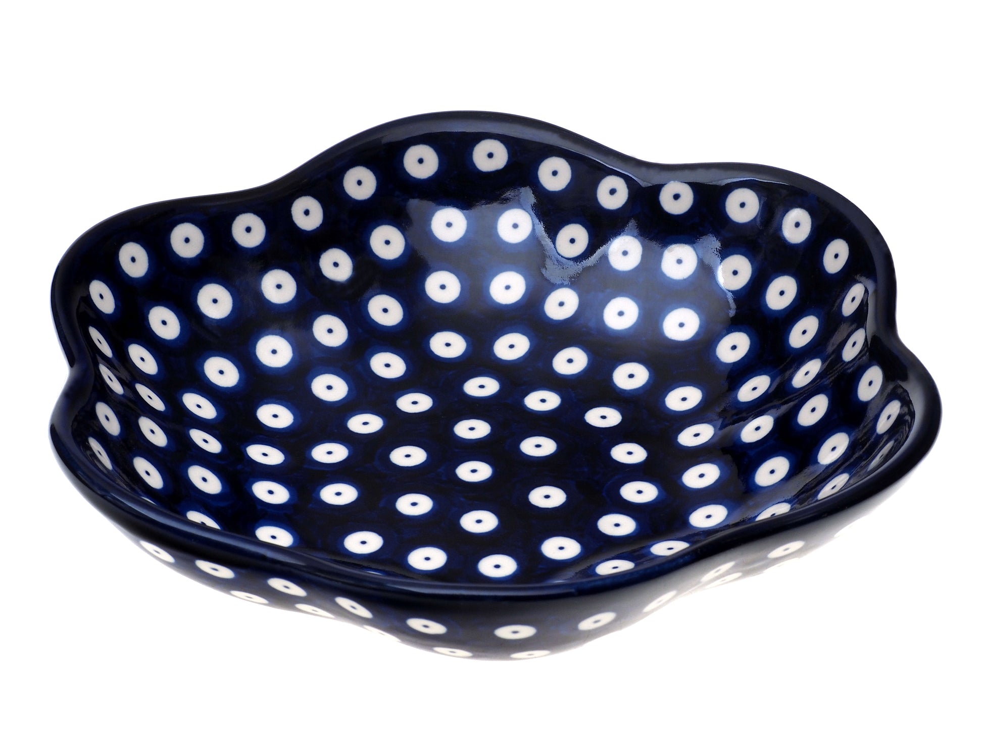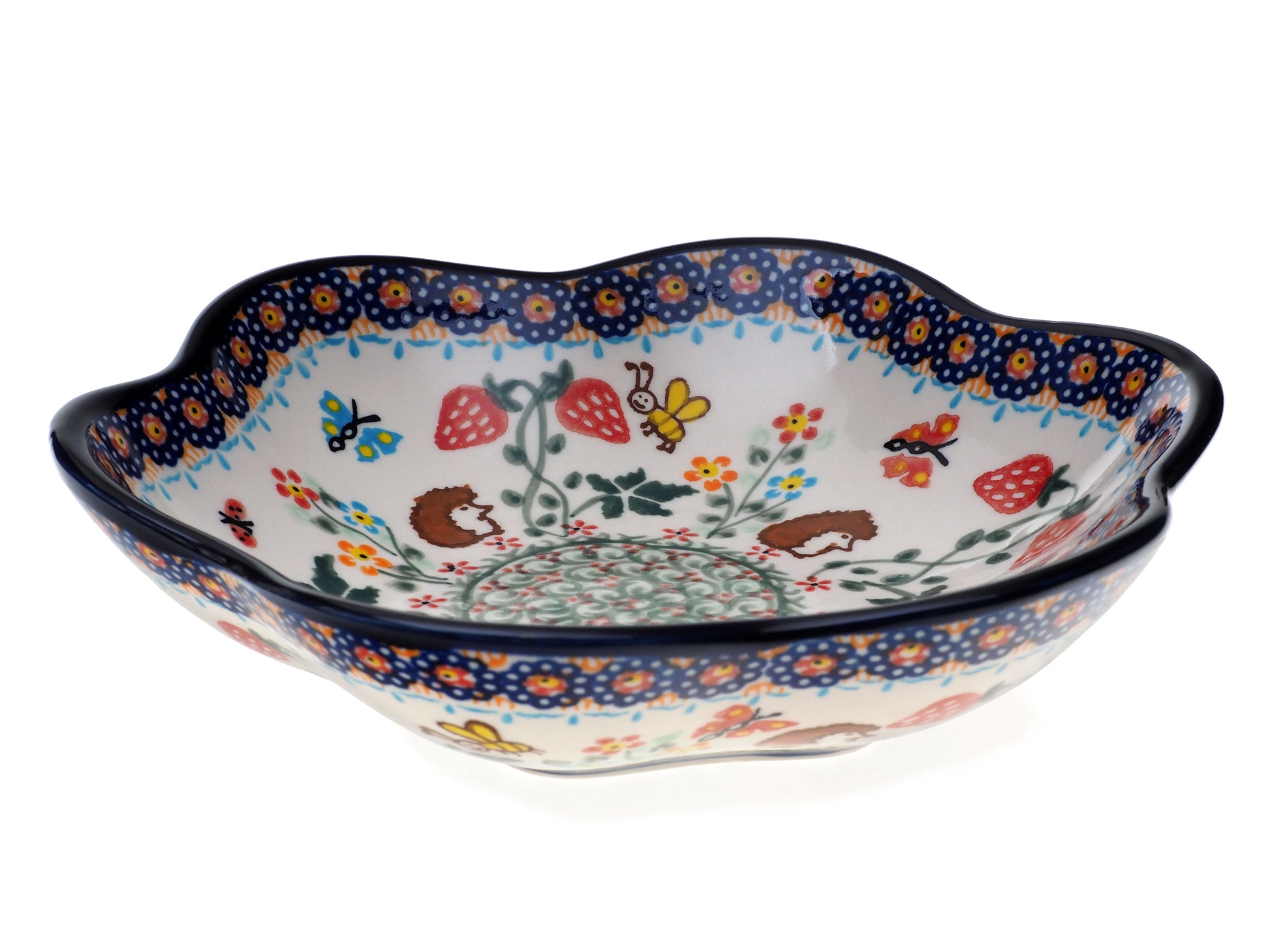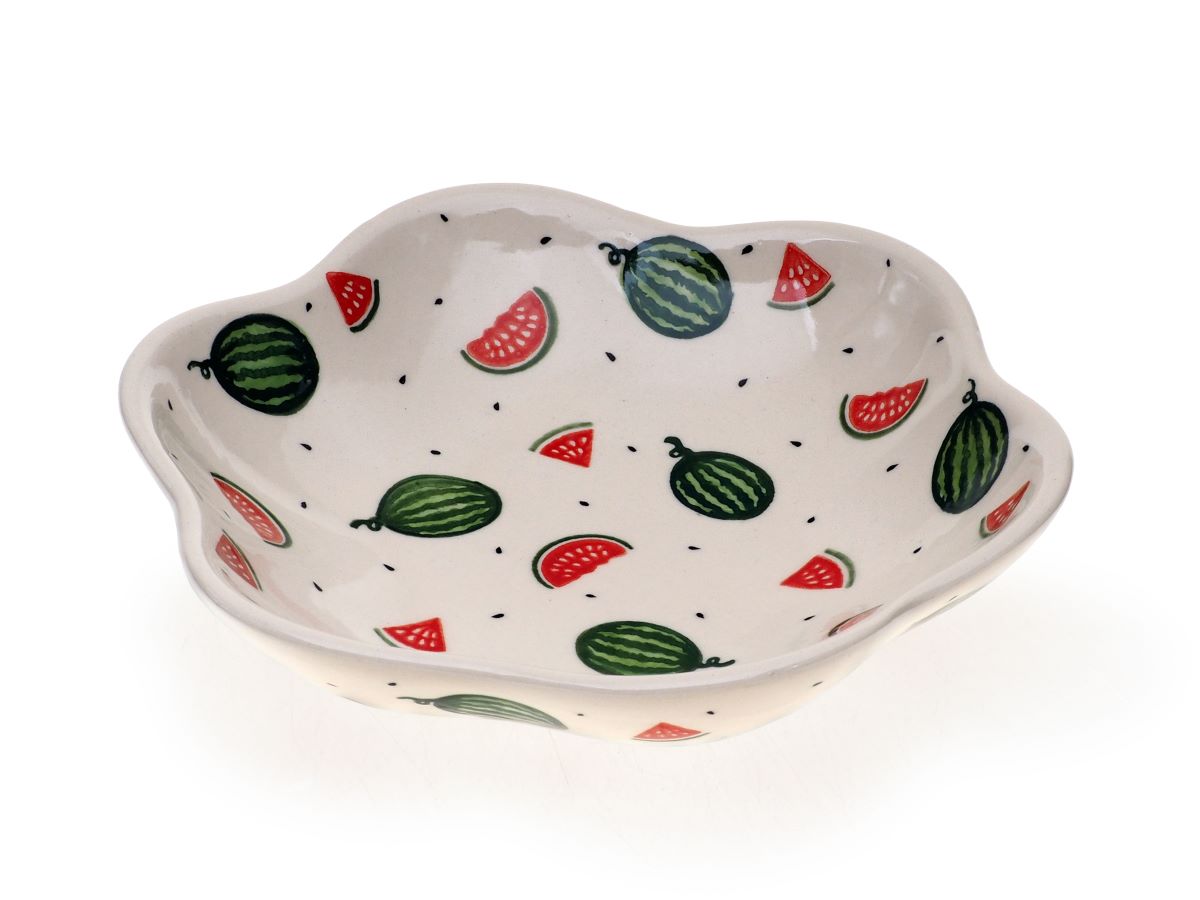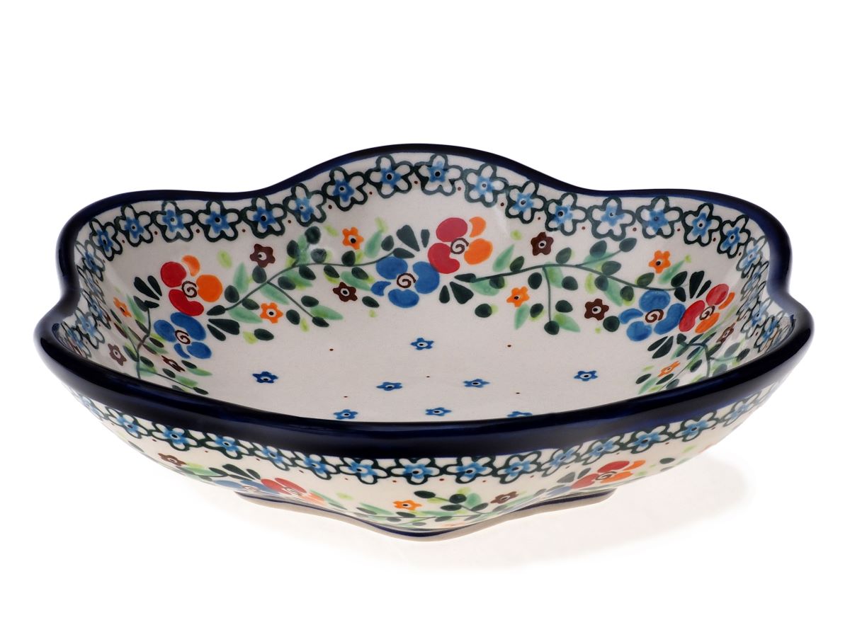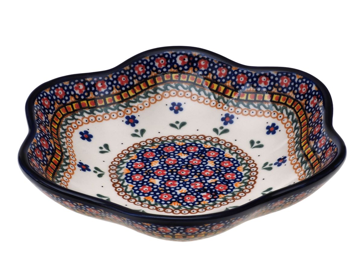 Miska wykonana jest z ceramiki i zdobiona ręcznie przy udziale ludzkich rąk. Naczynie jest wykonywane ręcznie z największą precyzją i jakością. Każdy egzemplarz powstaje indywidualnie, dlatego mogą występować drobne różnice w kolorystyce, wykończeniu lub rozmieszczeniu motywów dekoracyjnych. Są to naturalne cechy ceramiki bolesławieckiej, które świadczą o jej autentyczności i niepowtarzalnym charakterze.
