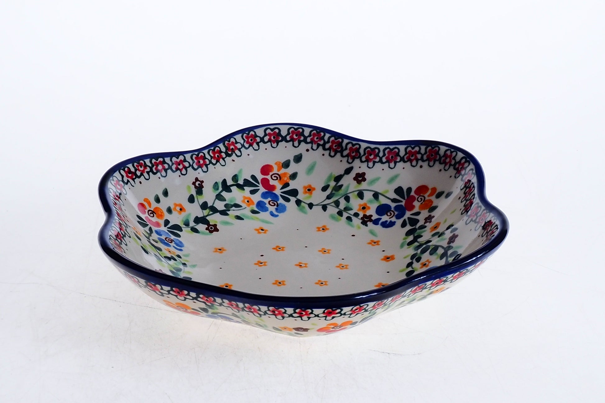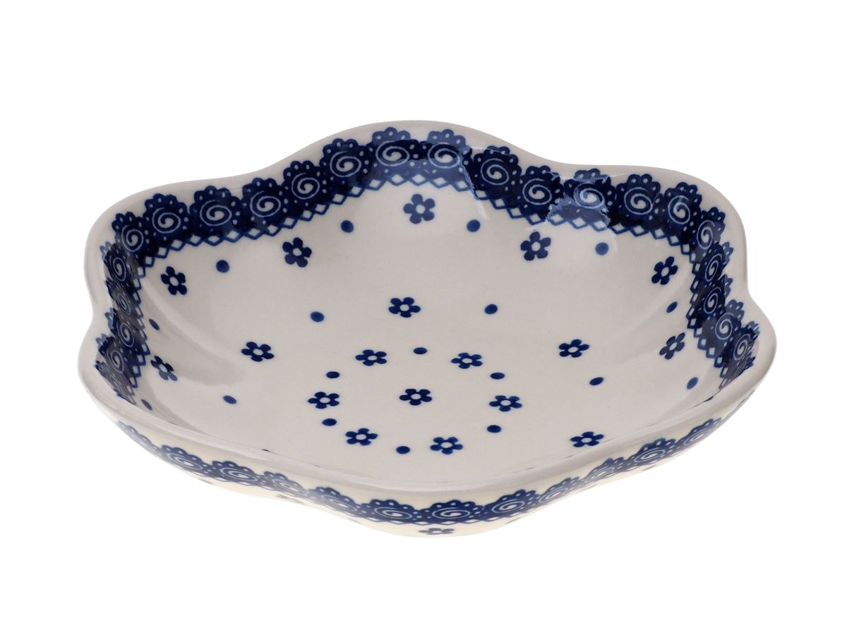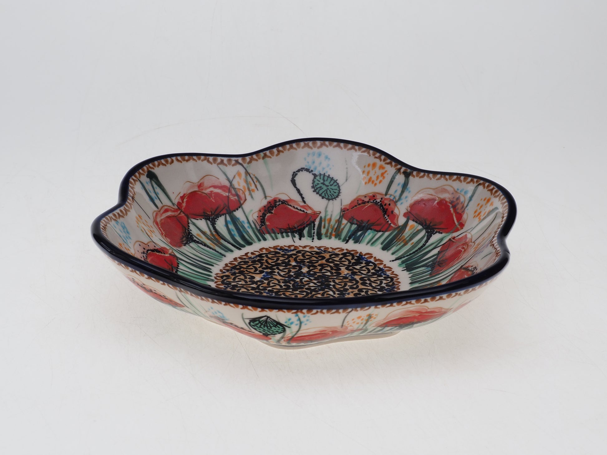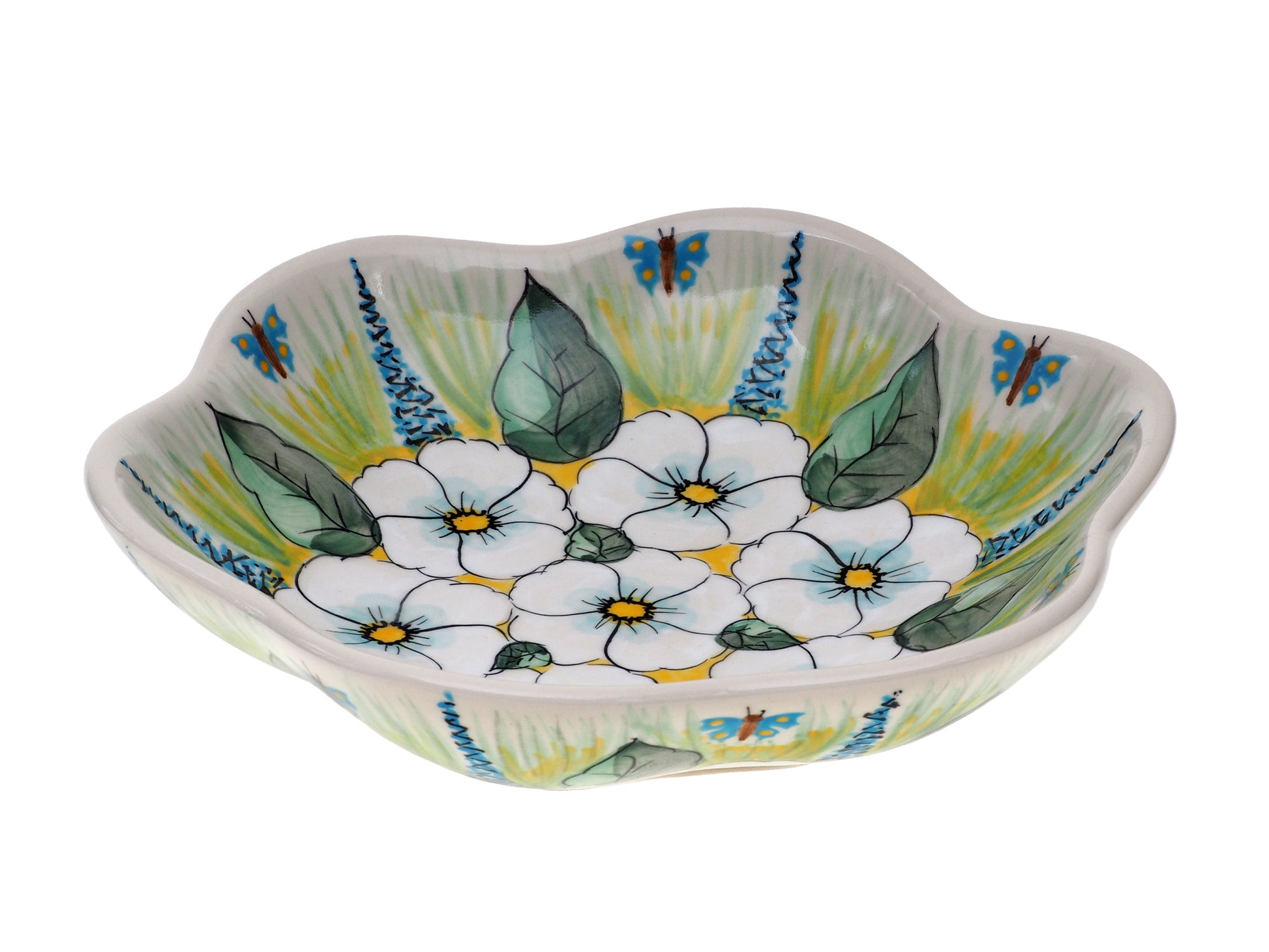 Miska wykonana jest z ceramiki i zdobiona ręcznie przy udziale ludzkich rąk. Naczynie jest wykonywane ręcznie z największą precyzją i jakością. Każdy egzemplarz powstaje indywidualnie, dlatego mogą występować drobne różnice w kolorystyce, wykończeniu lub rozmieszczeniu motywów dekoracyjnych. Są to naturalne cechy ceramiki bolesławieckiej, które świadczą o jej autentyczności i niepowtarzalnym charakterze.