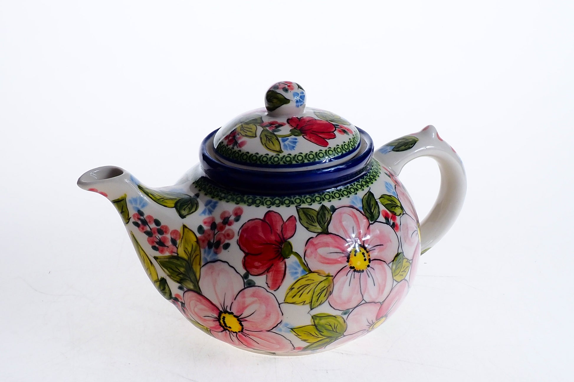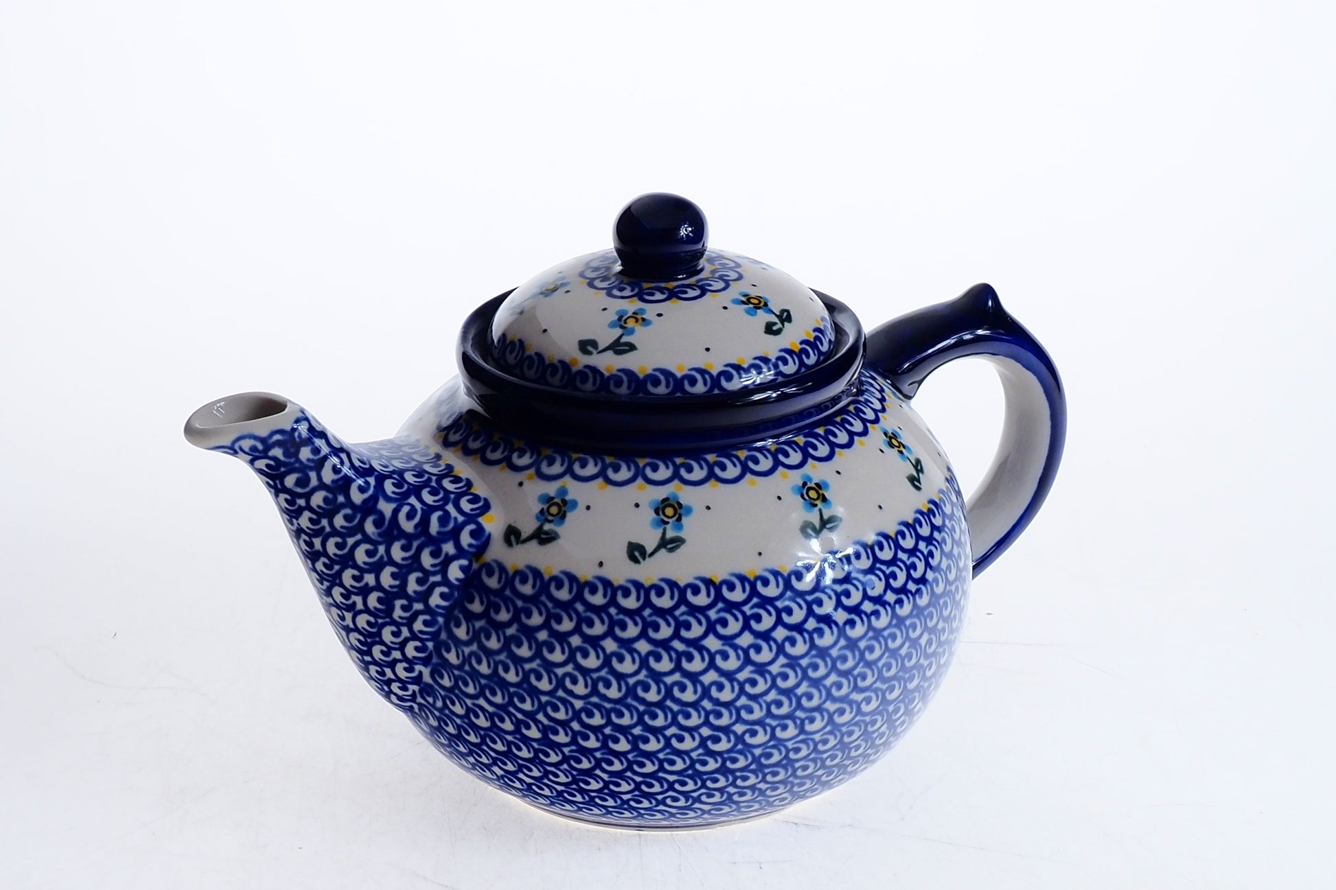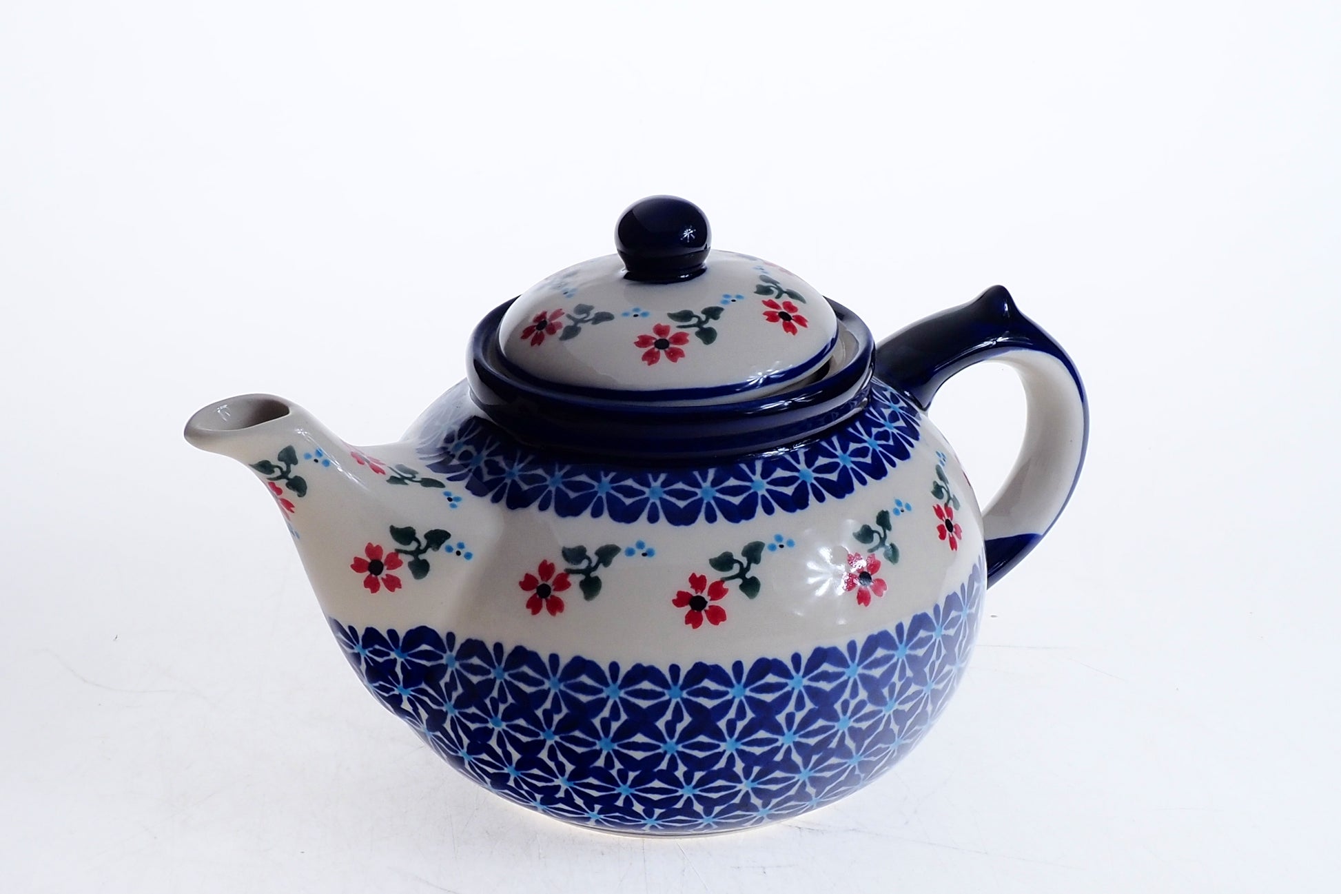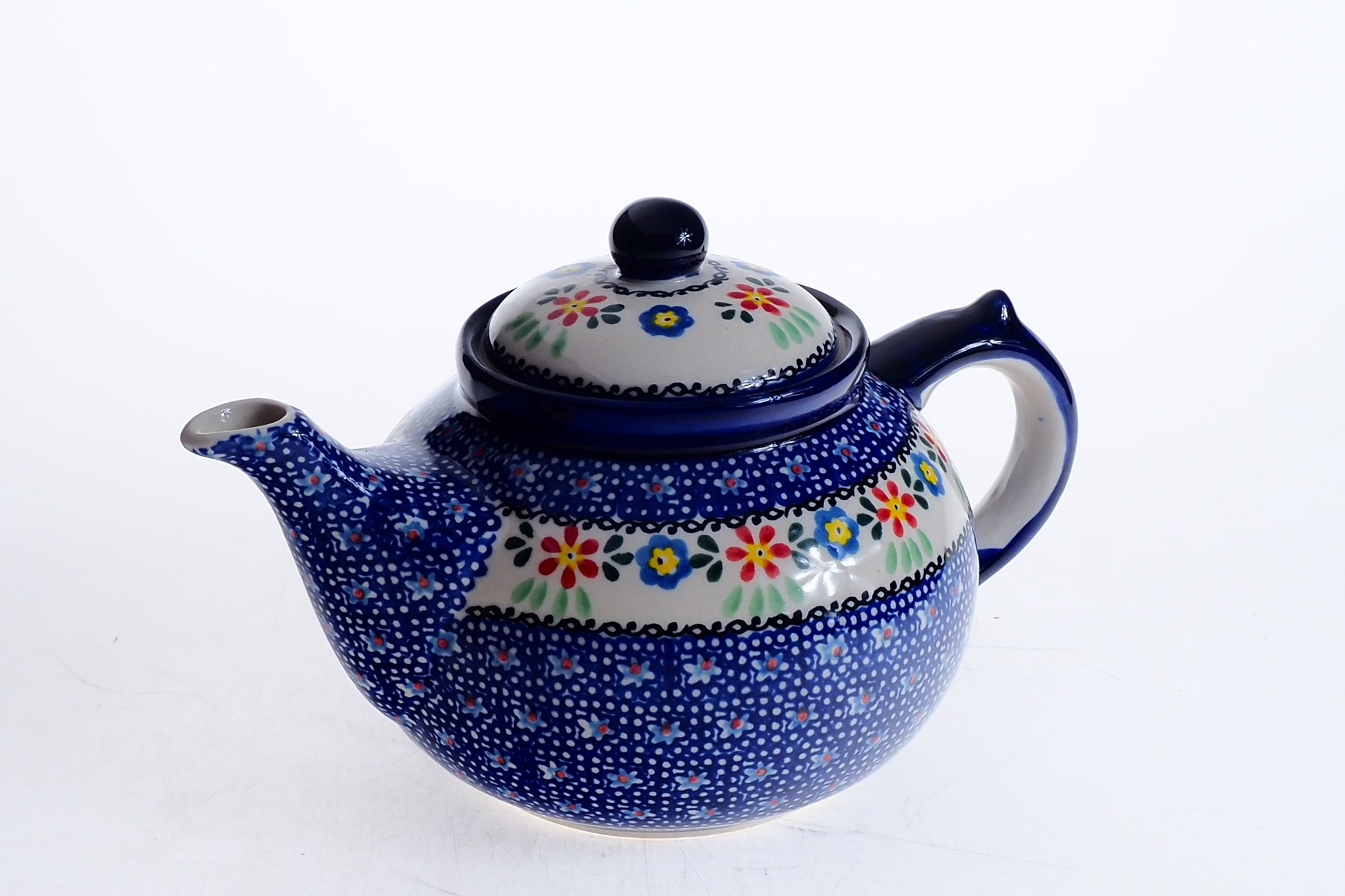 Czajnik wykonany jest z ceramiki i zdobiony ręcznie przy udziale ludzkich rąk. Naczynie jest wykonywane ręcznie z największą precyzją i jakością. Każdy egzemplarz powstaje indywidualnie, dlatego mogą występować drobne różnice w nasyceniu kolorów lub rozmieszczeniu motywów zdobniczych. Są to naturalne cechy rękodzieła, które sprawiają, że Twój czajnik jest unikatowy i wnosi do kuchni duszę tradycyjnego polskiego warsztatu.