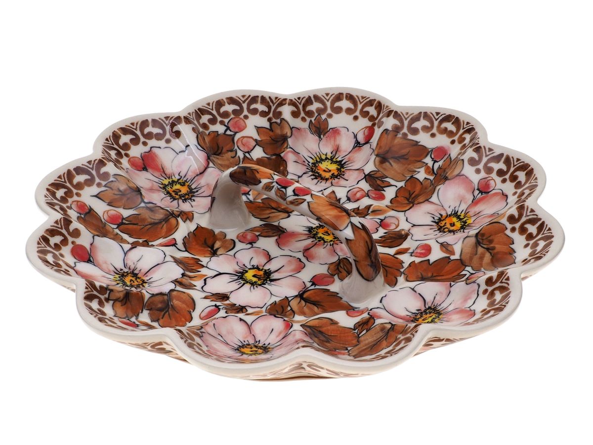 Talerz wykonany jest z ceramiki i zdobiony ręcznie przy udziale ludzkich rąk. Naczynie jest wykonywane ręcznie z największą precyzją i jakością. Każdy egzemplarz powstaje indywidualnie, dlatego mogą występować drobne różnice w kolorystyce, wykończeniu lub rozmieszczeniu dekoracji. Są to naturalne cechy ceramiki wykonywanej ręcznie i świadczą o jej unikatowym charakterze.