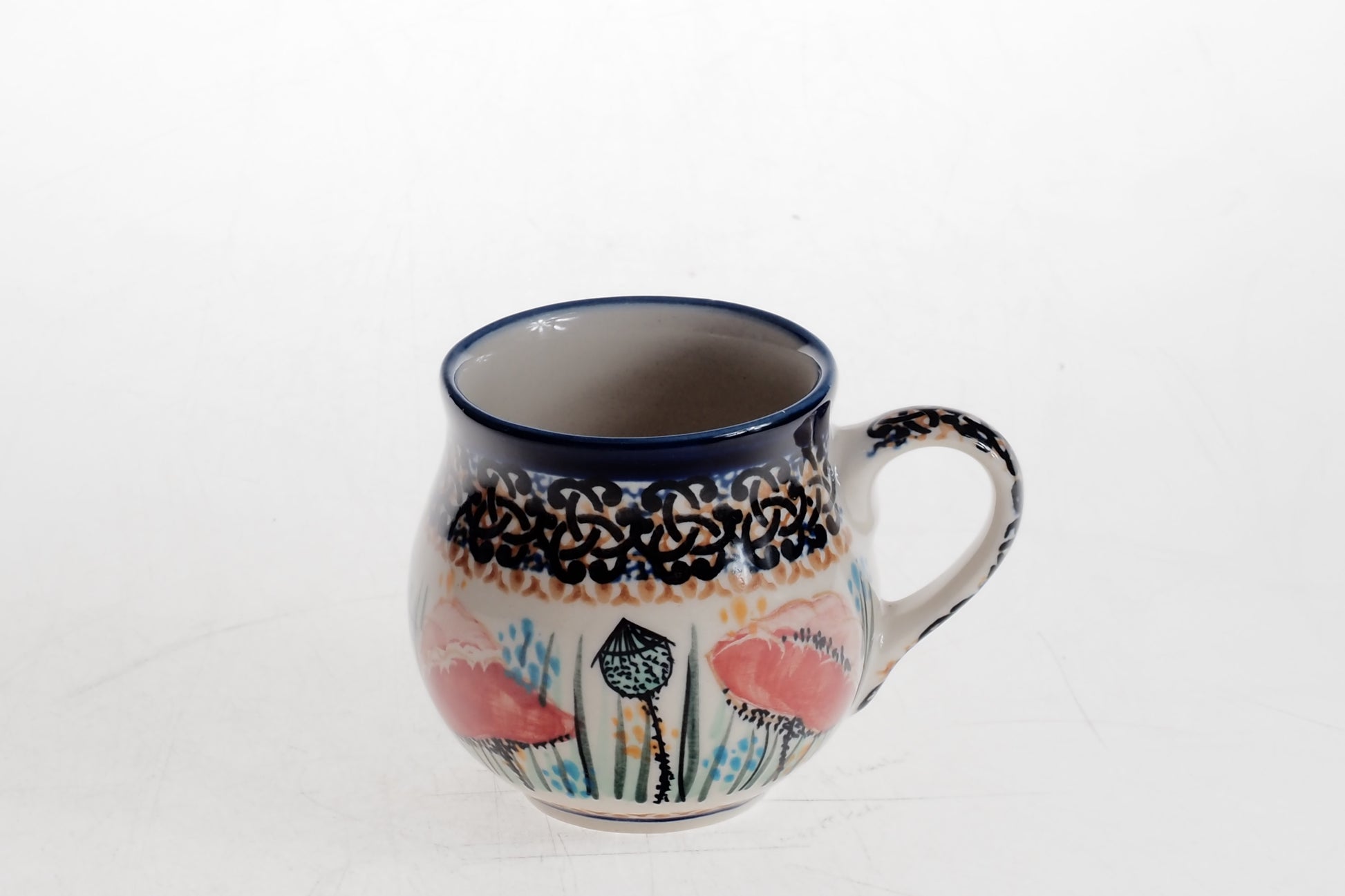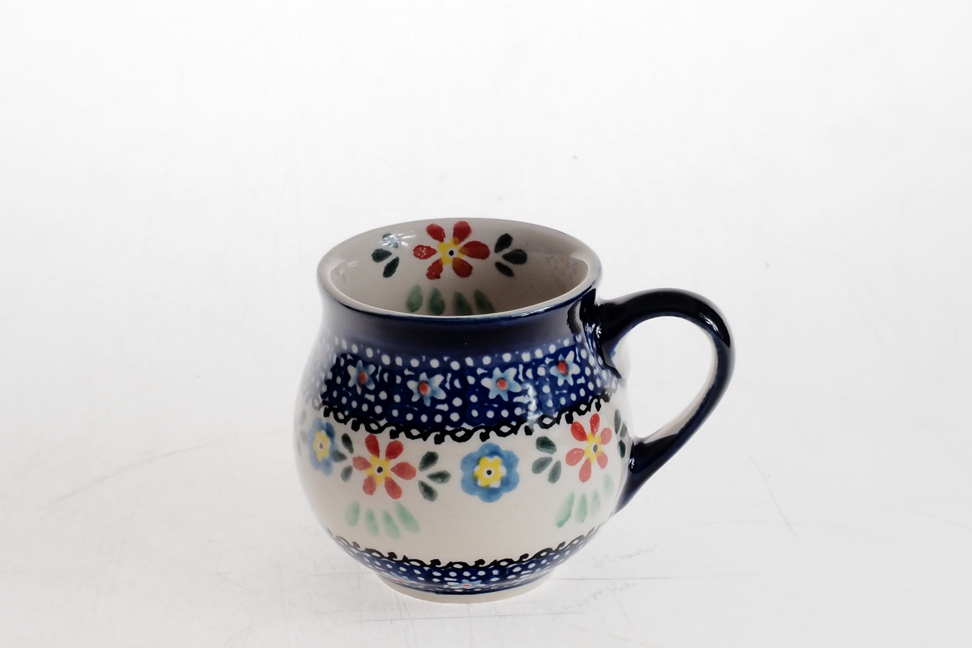 Kubek wykonany jest z ceramiki i zdobiony ręcznie przy udziale ludzkich rąk. Naczynie jest wykonywane ręcznie z największą precyzją i jakością. Każdy egzemplarz powstaje indywidualnie, dlatego mogą występować drobne różnice w kolorystyce, wykończeniu lub rozmieszczeniu dekoracji. Są to naturalne cechy ceramiki wykonywanej ręcznie i świadczą o jej unikatowym charakterze.