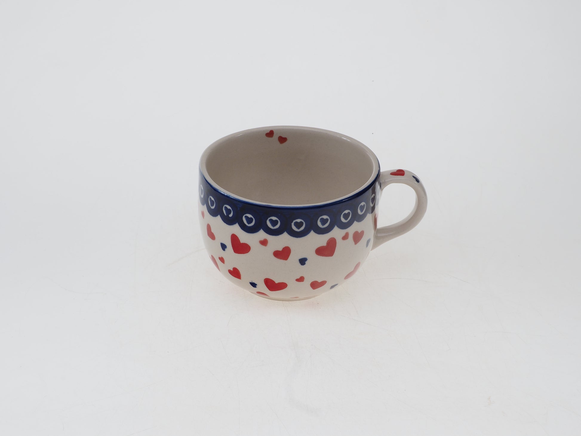 Kubek wykonany jest z ceramiki i zdobiony ręcznie przy udziale ludzkich rąk. Każdy egzemplarz powstaje indywidualnie, dlatego mogą występować niewielkie różnice w kształcie, kolorystyce lub rozmieszczeniu dekoracji. Są to naturalne cechy ceramiki wykonywanej ręcznie i nie stanowią wady produktu.