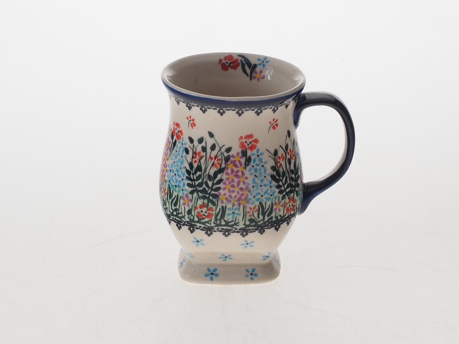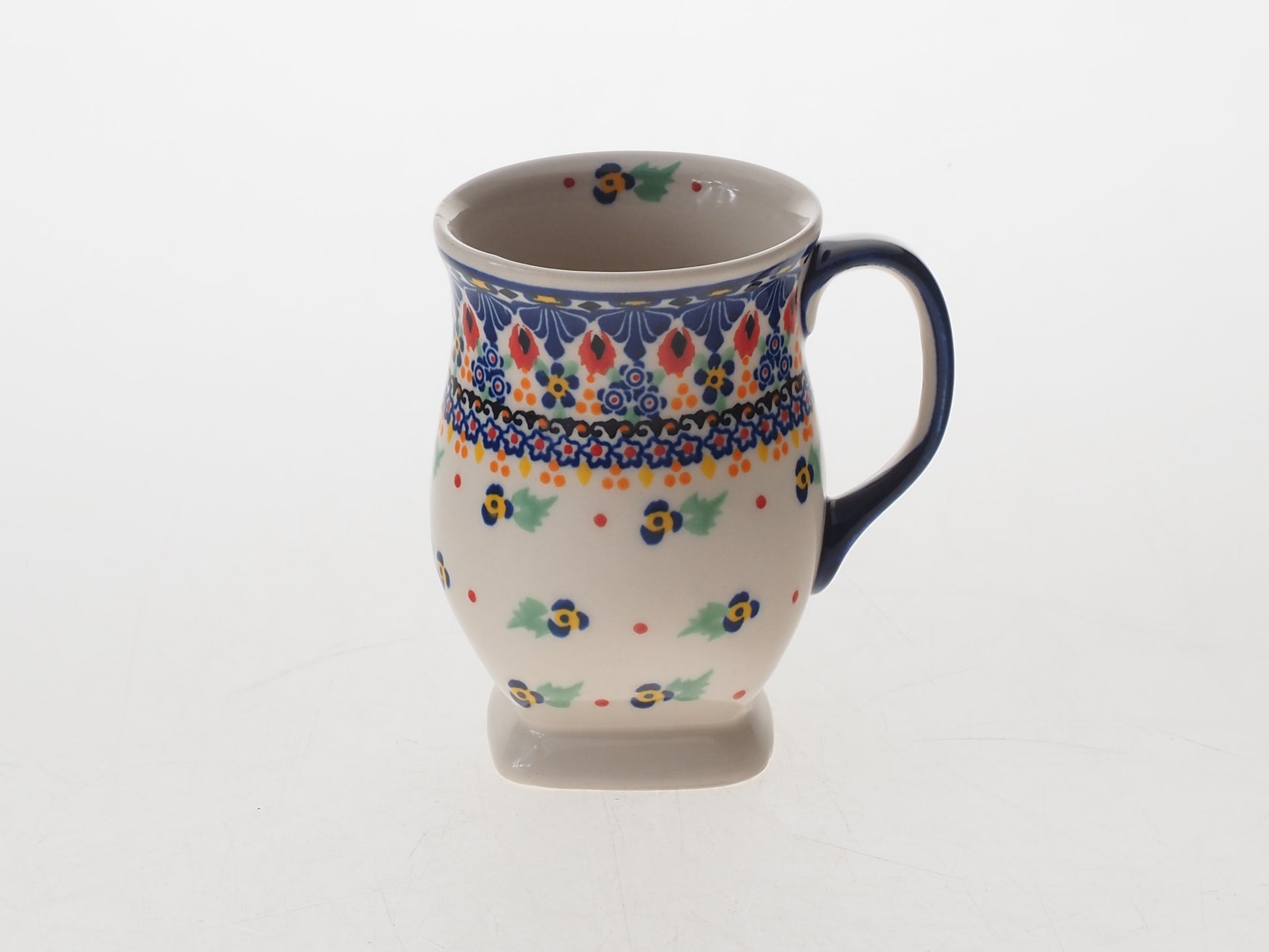 Kubek wykonany jest z ceramiki i zdobiony ręcznie przy udziale ludzkich rąk. Naczynie jest wykonywane ręcznie z największą precyzją i jakością. Każdy egzemplarz powstaje indywidualnie, dlatego mogą występować drobne różnice w kolorystyce, wykończeniu lub rozmieszczeniu dekoracji. Są to naturalne cechy ceramiki wykonywanej ręcznie i świadczą o jej unikatowym charakterze.