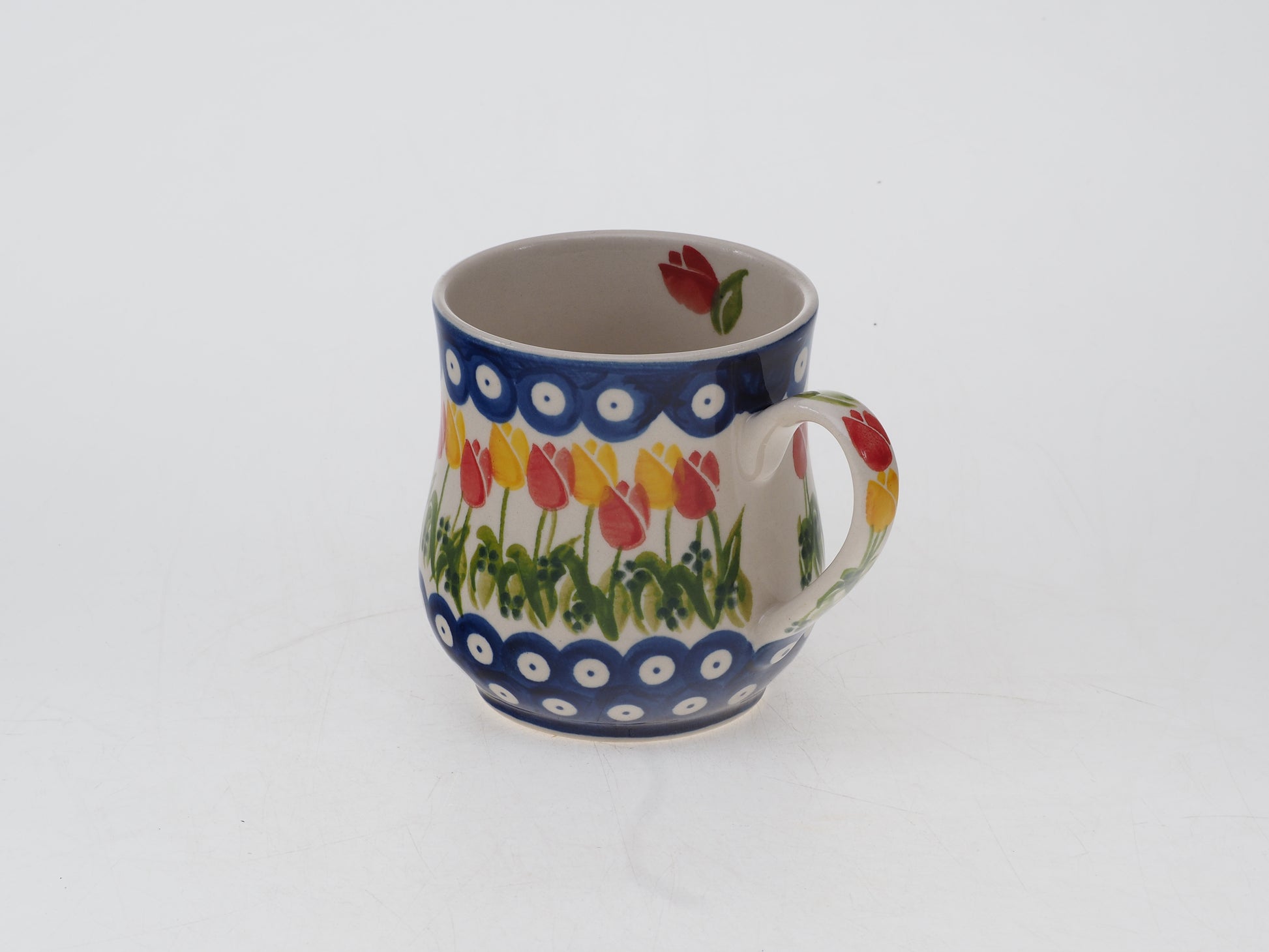 Produkt wykonany jest z ceramiki i zdobiony ręcznie. Każdy kubek powstaje w procesie rzemieślniczym, dlatego poszczególne egzemplarze mogą różnić się nieznacznie w zakresie koloru, intensywności zdobienia czy drobnych detali. Są to naturalne cechy ceramiki wykonywanej ręcznie i nie stanowią wady produktu.