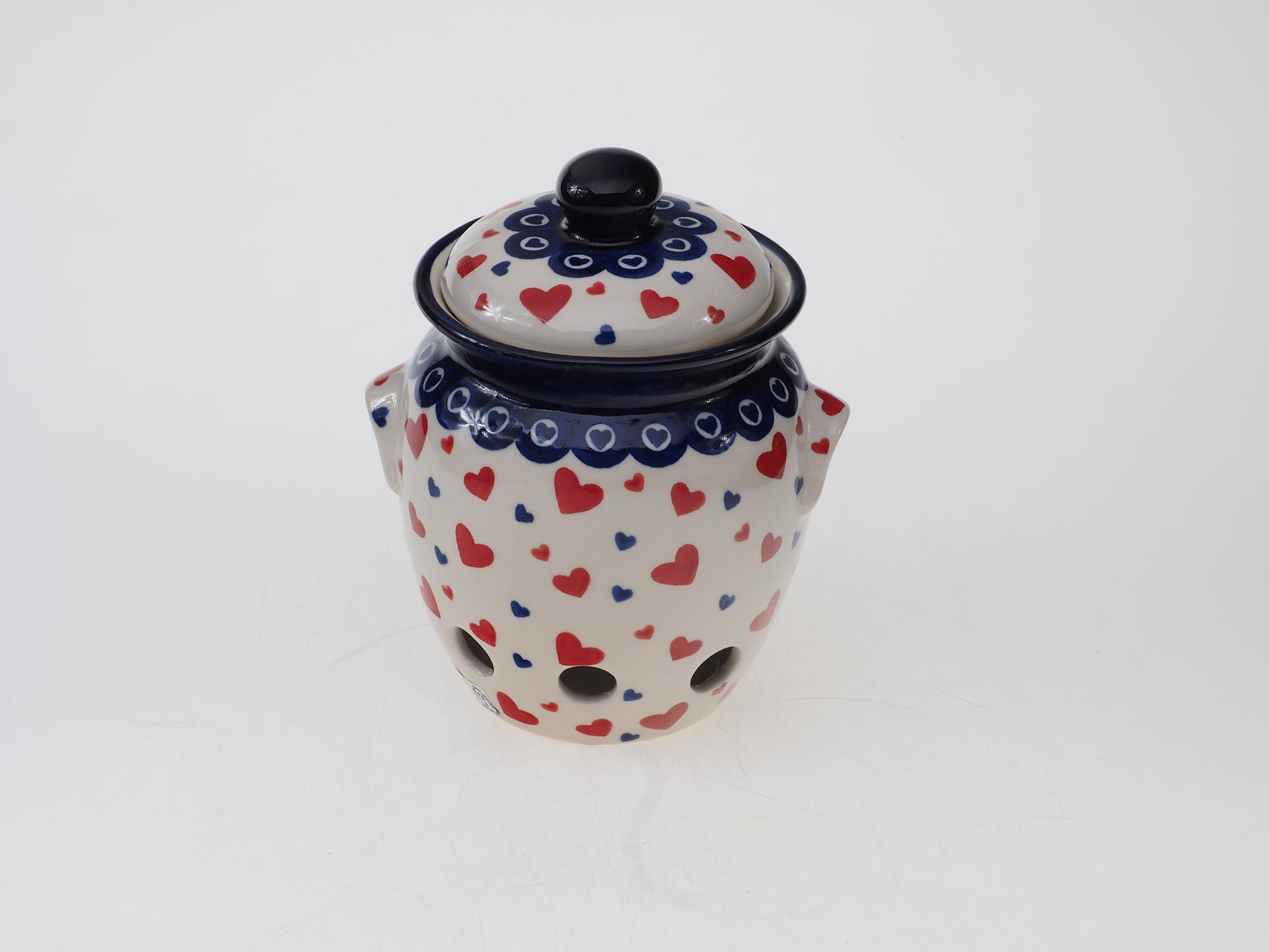 Ceramiczny pojemnik na czosnek o klasycznym kształcie z pokrywką, przeznaczony do higienicznego i estetycznego przechowywania czosnku w kuchni. Specjalne otwory w dolnej części zapewniają odpowiednią cyrkulację powietrza, co pozwala zachować świeżość warzyw na dłużej.