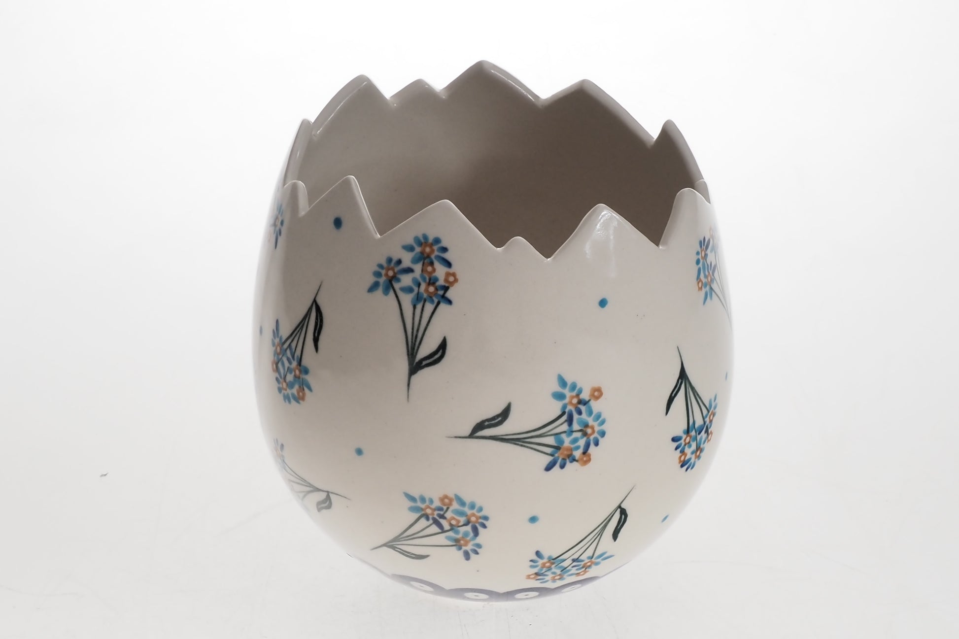 Wyjątkowa osłonka ceramiczna o finezyjnym kształcie pękniętej skorupki jajka, która stanowi doskonałe połączenie funkcji użytkowej z artystycznym designem. Idealna jako baza do wielkanocnych stroików, miejsce na wiosenne kwiaty cebulowe, takie jak hiacynty czy żonkile, lub jako oryginalny pojemnik na drobne upominki. Jej nieregularne, "poszarpane" krawędzie nadają kompozycji lekkości i naturalnego wdzięku, wprowadzając radosny, wiosenny nastrój do każdego wnętrza.