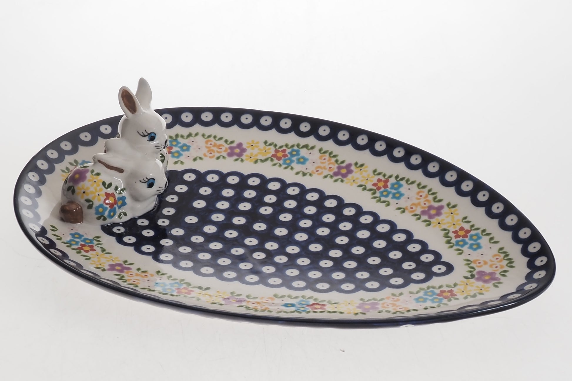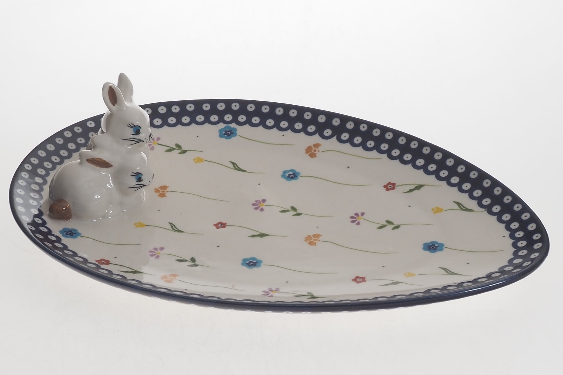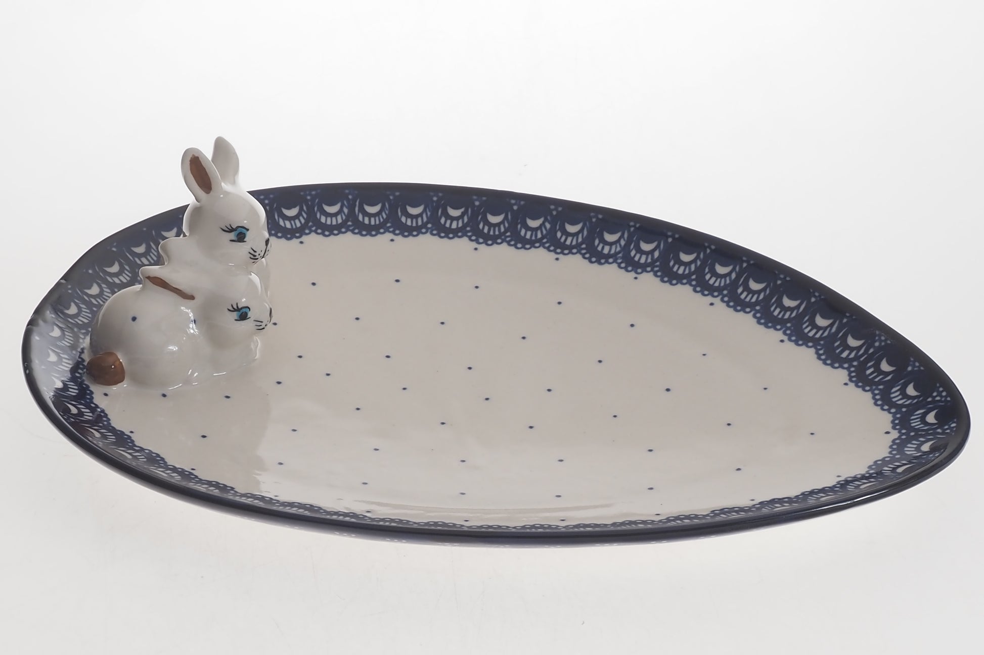 Talerz wielkanocny z motywem króliczków łączy funkcjonalność z tradycyjnym rzemiosłem i będzie najbardziej efektownym elementem Twojej świątecznej zastawy oraz cennym nabytkiem w ceramicznej kolekcji.