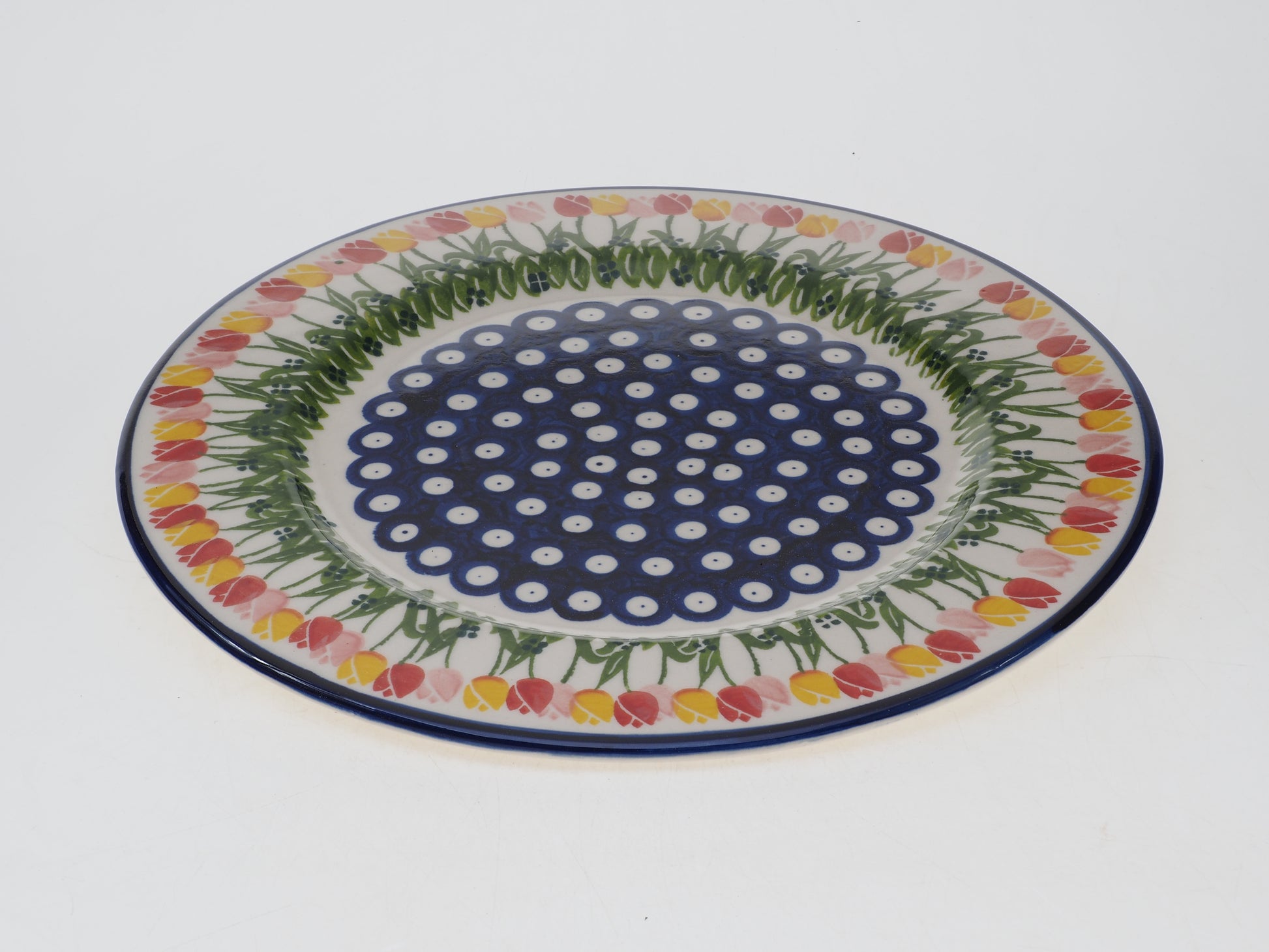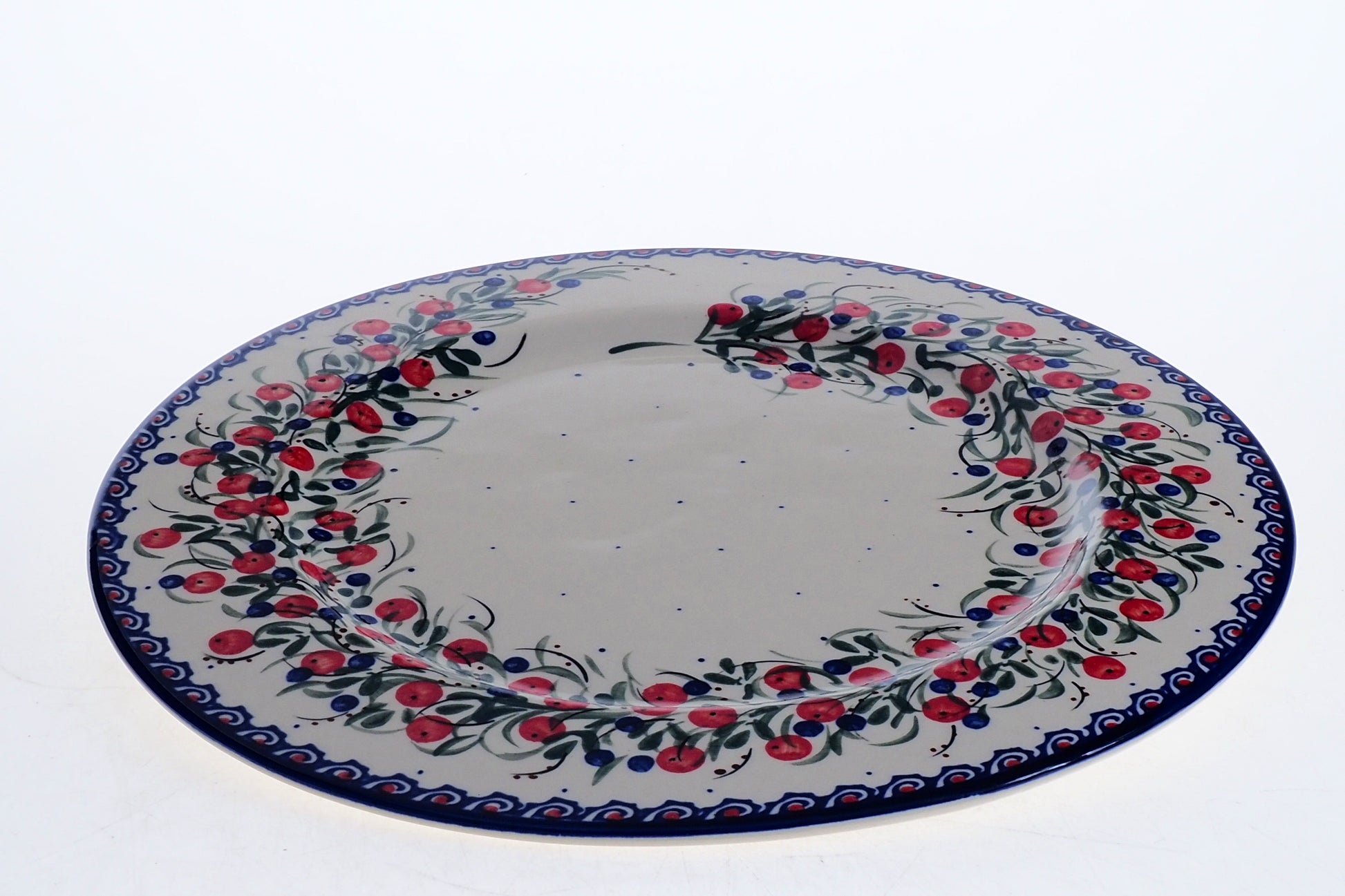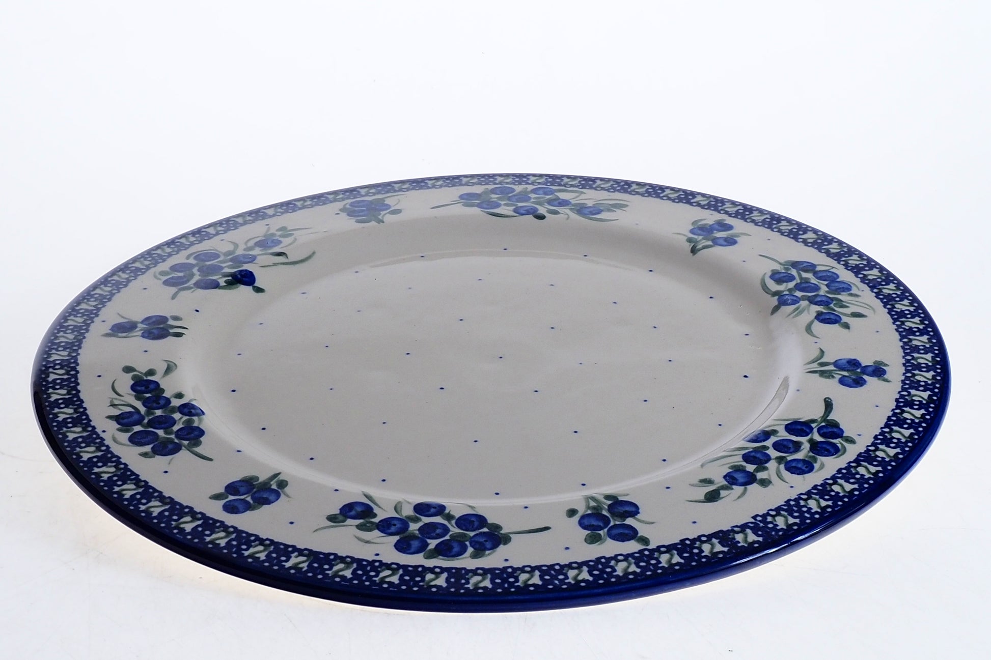 Ten imponujący talerz o średnicy 29 cm to naczynie o wyjątkowym profilu – jego niemal płaska powierzchnia i niski, 2-centymetrowy brzeg sprawiają, że idealnie pełni funkcję tacy. Jest to doskonała propozycja do serwowania całych tortów, domowych ciast, deski serów czy kolorowych przystawek. Dzięki dużej, płaskiej płaszczyźnie, ręcznie malowane wzory bolesławieckiej kamionki są tutaj wyeksponowane w całej okazałości, czyniąc z tego naczynia centralną ozdobę każdego stołu.